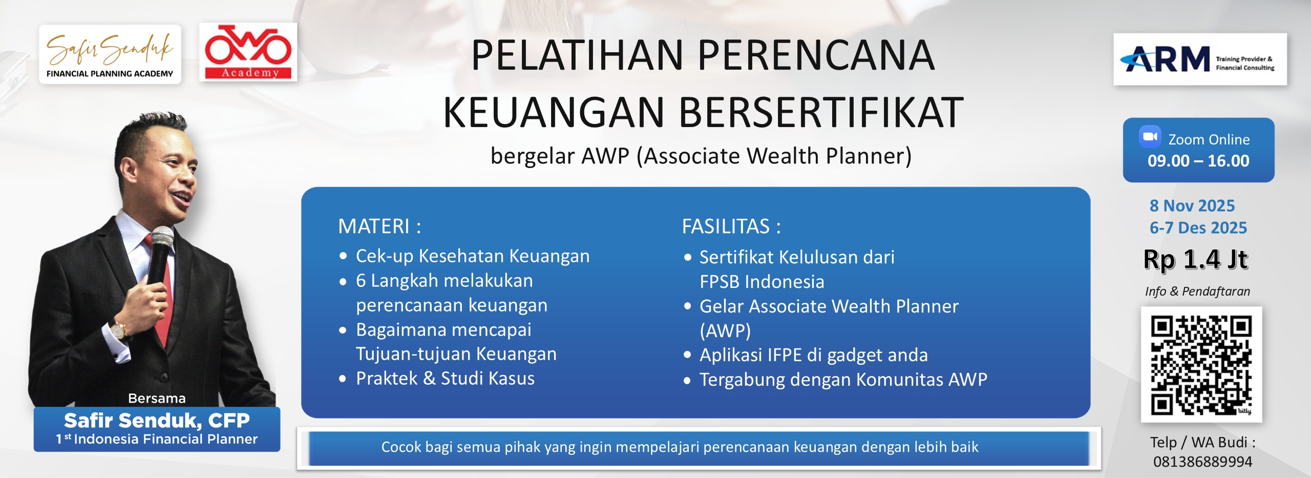 AWP program adalah pelatihan perencanaan keuangan berbasis digital yang komprehensif. Silabus sesuai standar FPSB Indonesia. Konsep perencanaan keuangan, pola anggaran belanja dan mengelola hutang
